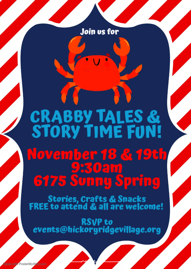 Join us for a snappy good time at Crab Storytime — a fun and engaging reading event perfect for little ones ages 0-5 years old and their adult friend(s) who love ocean adventures! We’ll dive into charming crab-themed stories, songs, and activities that will spark imaginations and wiggle some claws. Attendees will enjoy a story, crafts and treats. FREE to attend but please RSVP to events@hickoryridgevillage.org.