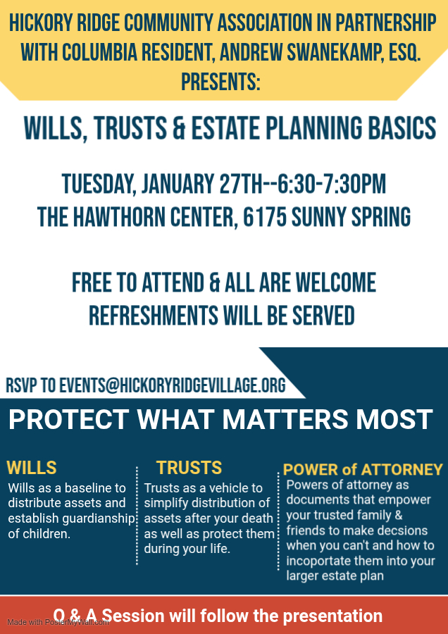 Protect what matters most. Free to attend. Please RSVP to events@hickoryridgevillage.org.