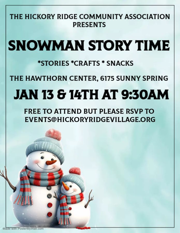 For children 5 and under and their adult friend. Please RSVP to events@hickoryridgevillage.org.